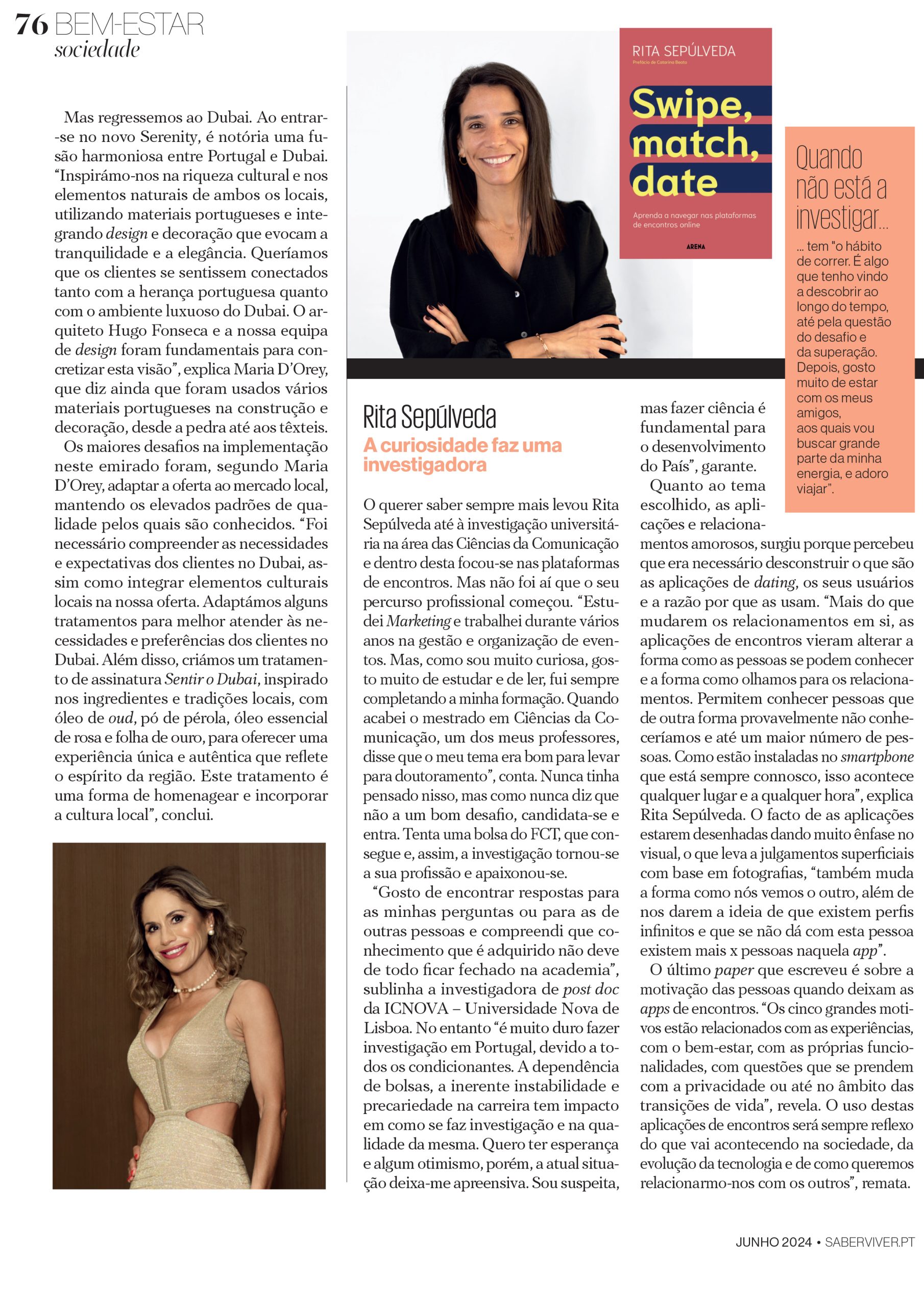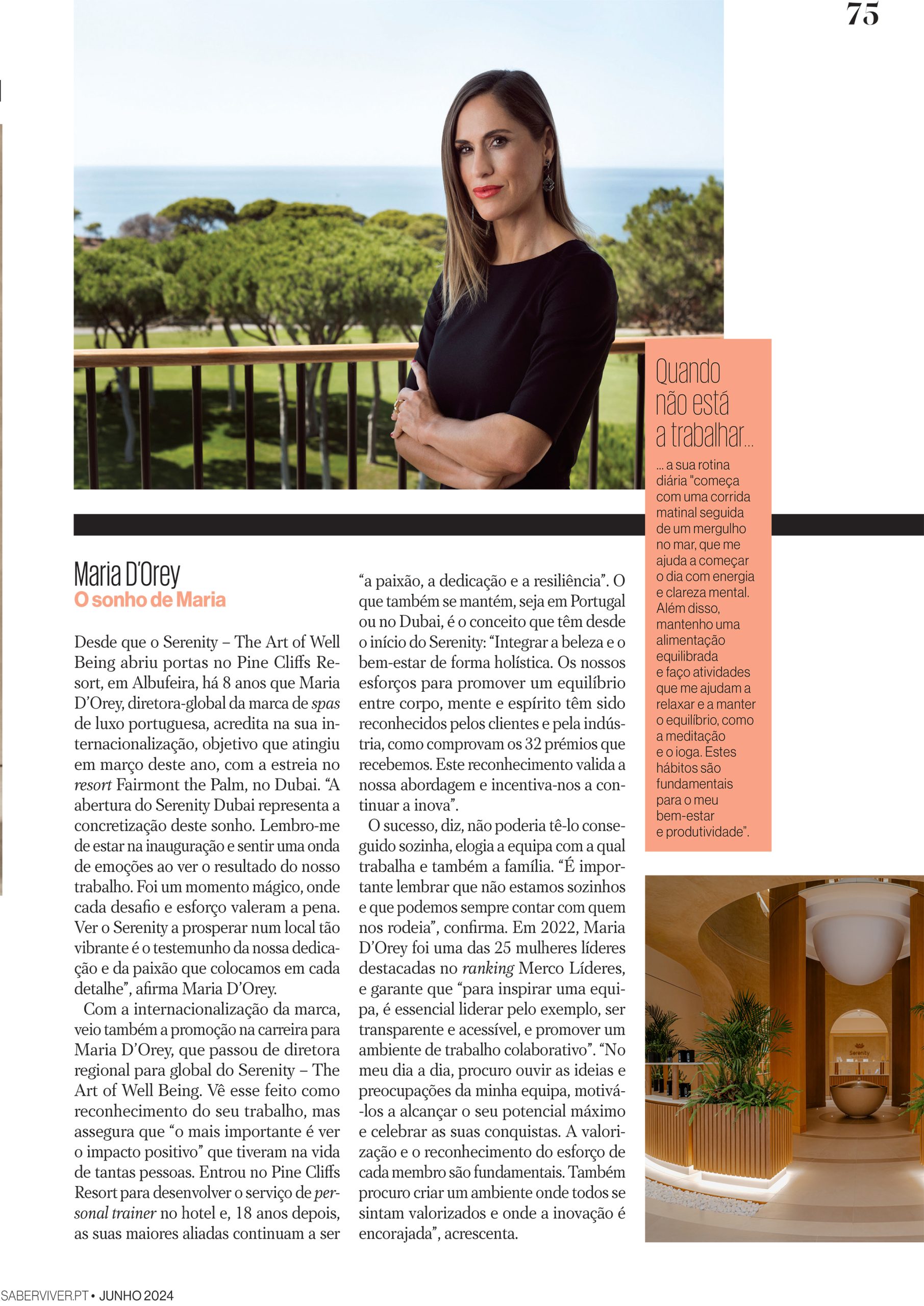 Na vibrante edição de Junho da revista Saber Viver, Maria d’Orey, diretora global da marca Serenity – The Art of Well Being, é destaque com a sua história inspiradora de sucesso e paixão pela área do bem-estar. O recente lançamento do Serenity Dubai, no luxuoso Fairmont The Palm, simboliza a internacionalização de uma marca que integra a beleza e o bem-estar de forma holística.
